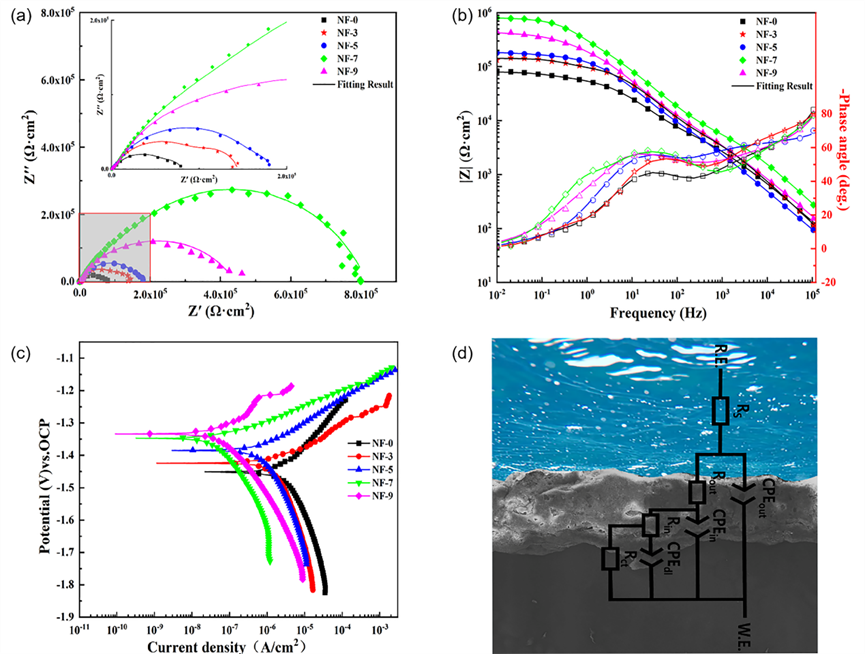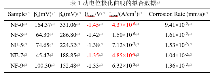 研究结论 1.采用螯合剂辅助法,成功使用恒流模式使镁合金在酸性电解液中成膜。 2.NaF对于MAO膜层结构具有重要影响,添加不同浓度NaF均能够在镁合金上成功制备一层较为致密的MAO膜层,并且部分孔洞被封闭,膜层的孔隙率显著降低,F元素会在膜层及基体结合处生长一层以MgF2为主的致密层。 3.通过在3.5wt.% NaCl溶液中测试得到的电化学阻抗谱和动电位极化曲线数据分析,可以确认添加7g/L NaF样品的耐蚀性最佳,耐蚀性较未添加时有较大提升。