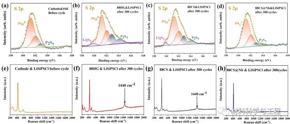 从拉曼光谱来看,循环后88HG/LSiPSCl复合阴极在1441cm-1处形成了一个新的峰值,对应于阴极与POx-和SOx2-等硫化物电解质之间的不良反应产物。这表明88HG阴极和电解质界面在循环过程中的不稳定性导致了副反应的发生,这可能与88HG表面的高镍含量直接相关。相比之下,循环后88CS/LSiPSCl的拉曼光谱图中,1441cm-1处的副产物峰明显减少,低镍含量的外壳有效降低了界面反应的强度。相比之下,循环后88CS@Nb/LSiPSCL的复合阴极拉曼光谱中几乎没有1441cm-1的副产物峰,这再一次证实了核壳和LiNbO3涂层协同作用可以显著抑制界面反应,提高界面的稳定性。