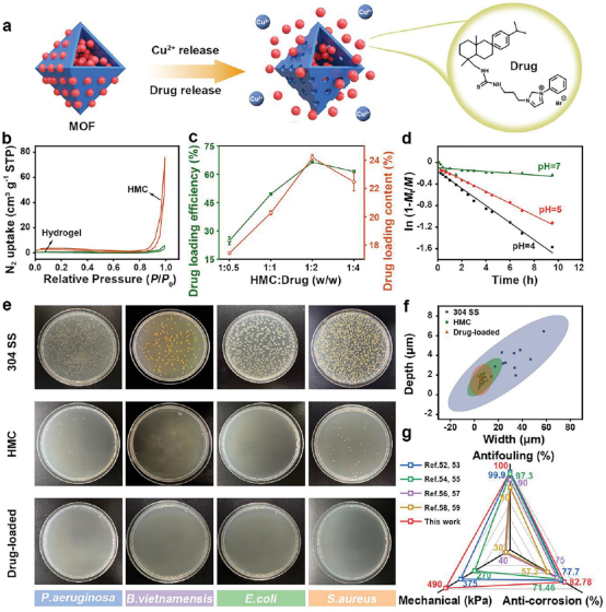 MOFs是由金属团簇或金属离子和有机接头组成的一类新兴的晶体配位材料。内在的多孔特性、分散良好的活性中心和丰富的功能使MOF成为化学、能源、环境和生物医学领域很有前途的候选者。近年来,在防止细菌附着、抑制细菌产生和杀死细菌方面的成功应用得到了广泛的研究。MOFs非凡的设计性为我们提供了一个通过合理选择金属离子/团簇或有机接头在分子水平上优化抗菌性能的机会,这被认为是MOFs相对于传统杀菌杀伤材料的显着竞争优势。此外,MOFs由于其多样化的空间结构和可调的组成,在靶向药物的通用载体中获得多种生物活性能力方面发挥着至关重要的作用。释放的金属离子、接头和药物可以与细菌细胞膜相互作用,干扰代谢活动,引起细胞成分泄漏,最终杀死微生物。特别是可调释放过程可以通过调节MOFs的结构稳定性,从晶体、尺寸和构建单元进行调节,从而降低毒性,延长有效时间,并成功避免内源性积累。因此,MOFs在缓解海洋生物污染和MIC劣化方面表现出很高的潜力。
