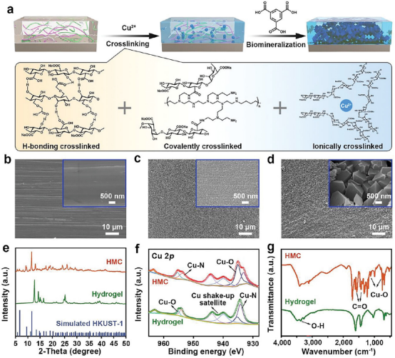 近日,东北大学的徐大可团队受珍珠母内无定形/结晶特征的启发,开发了一种由生物聚合物基水凝胶和致密金属有机骨架(MOFs)组成的机械坚固防污涂层。跨多尺度界面定制交联网络可以提供强度、消散应变并提高构建块的韧性,从而在各种基板上实现牢固且可扩展的配置,无论材料类别和表面拓扑如何。所得涂层作为合适的储层表现出独特的智能MOF降解或药物释放的主动防御行为,为广谱生物污染和腐蚀控制提供了突破性的性能。值得注意的是,在复杂的生物环境中进行长时间的测试过程中,既没有观察到海洋生物的附着,也没有观察到金属基质的MIC。本研究为综合防污腐蚀的潜在多机理提供了独特的见解,并开创了在海洋环境中设计下一代可靠MOFs衍生涂料的合理策略。该研究工作以题为“Nacre-Inspired Metal-Organic Framework Coatings Reinforced by Multiscale Hierarchical Cross-linking for Integrated Antifouling and Anti-Microbial Corrosion”的论文发表在国际顶级期刊《Advanced Functional Materials》上。本文报道了一种水凝胶锚定的MOF基涂层(HMC),该涂层模仿珠母无定形/结晶异相结构,以增强物理化学稳定性并增强其防污腐蚀性能。HMC是通过以原位渗透生物矿化方式组装多尺度构建块来实现的。这些构建块由纳米级增强和防污MOF单元组成,由含有海藻酸钠(SA),羧甲基纤维素(CMC)和聚乙烯亚胺(PEI)的复杂水凝胶粘合。具体而言,SA提供了丰富的MOF核,CMC提高了材料的柔韧性,而PEI增强了与基体的界面结合力,消除了表面电荷效应。在分层形貌和与天然珍珠层高度相似的化学成分的适当组合的鼓励下,所得HMC不仅显示出与表面无关的附着力,而且还具有机械坚固的防污腐蚀能力。合成的HMC可以容易均匀地涂覆在金属、橡胶、玻璃和塑料等不同的靶材上,而无需费力的表面预处理。HMC是在温和的条件下通过水凝胶锚定涂装方法制造的,指的是在固体表面上稳定地粘附防污腐蚀MOF基层的两步技术。通常,作为基于软生物聚合物的相,首先在基材上构建具有明确厚度的极其坚韧的水凝胶。使用具有氢键和共价交联网络的SA,CMC和PEI作为前体浆液,以模拟天然珍珠层中的多尺度部分。二价金属离子,如铜离子(Cu2+)可以以高度协同的方式优先与藻酸盐链的古尿酸嵌段结合,并入水凝胶中,通过离子交联进一步改善机械行为。毫无疑问,所得的水凝胶在多个尺度上具有高密度交联界面,可作为后续反应的受限成核反应器。然后,针对海藻酸盐中的金属离子,通过在水凝胶体系中沉积有机接头来介导原位生物矿化过程,从而得到纳米级表面附着的MOF异相单元。配位效应和约束效应的网络纠缠保证了水凝胶和MOF之间的稳定键合。最后,在表面完整地生成了具有高度有序结构的珍珠层启发的HMC。系统地研究了HMC的力学性能,以评估异质相“实体”结构在多尺度界面下的有效性。最佳SA/CMC水凝胶的拉伸性能(4:1)优于其他二元竞争者,实现了高拉伸强度(466.1 ± 5.8 kPa)和拉伸性(极限应变高达760%)的独特集成。可以看出,过量的CMC含量会使水凝胶由于分子间力和界面粘附力的恶化而不易变形和脆性。根据耗能机制,引入PEI链作为共价交联结构域,进一步提高水凝胶的韧性和MOF增强单元的承载能力。同时,PEI作为一种带正电荷的聚电解质,可以与带负电荷的SA/CMC结合形成电荷平衡表面,减少与污染物的静电相互作用,最大限度地减少生物污染粘附。由于蛋白质是海洋生物污染初始阶段的关键成分,因此选择牛血清白蛋白(BSA)作为模型污染物来监测不同表面的茴香粘附性能。一旦材料浸入BSA溶液中,对所有表面都进行了污染物的强烈吸收。达到稳定吸收后,引入PBS溶液去除表面上松散粘合的BSA。BSA在HMC上几乎完全可逆的吸附-解吸显示出高效的防污性能,其源于水凝胶-MOF异相结构,产生强烈的界面水合和空间排斥,以防止调节膜的形成。为了探索HMC的防污多样性,以小球藻属、加尔巴纳异趾菌和三角趾藻为典型生物,测试了涂层上藻类生物膜的生长状态。结果表明,HMC对广泛的生物污染物(包括蛋白质,细菌和藻类)表现出非凡的防污能力。在海洋环境下,极易发生微生物附着和腐蚀性生物膜形成的金属材料除了海洋生物污染外,还不可避免地要经历MIC。众所周知,MIC工艺会导致金属表面周围的局部酸性微环境,这可能会触发MOFs的快速降解以增强抗菌效果。而该研究的HMC具有独特的致密微观结构和抗菌能力,在抑制MIC方面具有极好的前景。因此,HMC因其在金属微生物腐蚀抑制方面的巨大潜力而被确定,这归因于包含致密异质相构型的保护屏障的三重协同效应,pH触发的Cu2+,以及强化的界面相互作用。由于其高比表面积和丰富的孔隙率,MOFs可以作为多功能加载平台,在释放前分离和保护药物,实现积累后的及时杀菌剂释放。MOFs的密集构建可以保证HMCs丰富的多孔结构,使其具有载药能力。此外,载药HMC将通过针对污垢生物体粘附行为的可控药物释放提供积极和稳定的防御。考虑到其独特的优势,相信HMC有可能为防污和防腐蚀提供有效的便携式解决方案。总之,该研究展示了一种符合仿生“实体”设计的工程水凝胶锚定MOFs涂层,该涂层克服了天然MOFs的性能-加工性权衡,并实现了稳健有效的防污腐蚀应用。结合有序的异相结构和多尺度界面交联相互作用,通过足够的能量耗散使所得涂层具有增强的强度和外在韧性。独立于表面的锚定能力是由生