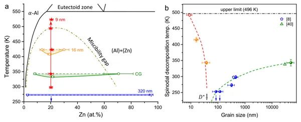 大量研究表明,塑性变形诱导的晶粒细化在材料内部引入高密度的晶界、空位和位错等缺陷,这些缺陷作为扩散的通道,会加剧原子扩散。在晶粒被充分细化的金属和合金中,包括晶粒长大、第二相析出以及调幅分解在内的各种扩散过程被显著促进,这些现象在晶粒尺寸处于亚微米尺度的金属和合金中尤为显著。 近期,中国科学院金属研究所沈阳材料科学国家研究中心纳米金属科学家工作室在这一科学难题研究方面取得新突破。研究团队利用自主研发的低温塑性变形技术,将成分位于互溶间隙内的过饱和Al-21.7at%Zn合金的晶粒尺寸细化至10 nm以下并获得受限晶体结构。研究发现,单相过饱和固溶体结构受限晶体Al-21.7at%Zn合金具有极高的结构稳定性,其在互溶间隙温度范围内的调幅分解行为被完全抑制。此现象源于平均曲率为零的三维极小面界面结构以及极小尺寸晶粒内空位缺失同时抑制了置换式固溶体原子的晶间扩散和晶格扩散。此发现表明受限晶体结构可以有效抑制合金中各种由扩散控制的相变过程,进一步证明了这种新型亚稳结构在金属材料中的普适性,为提高过饱和固溶体稳定性以及发展高性能金属材料具有重要意义。 相关研究成果以“Stabilizing Supersaturation with Extreme Grain Refinement in Spinodal Aluminum Alloys”为题在Advanced Materials期刊在线发表(DOI:10.1002/adma.202303650 )。沈阳材料科学国家研究中心徐伟副研究员、博士生钟一鸣为共同第一作者,卢柯研究员、李秀艳研究员为通讯作者。 上述工作得到了国家重点研发计划、国家自然科学基金以及中国科协青年人才托举工程等项目的支持。