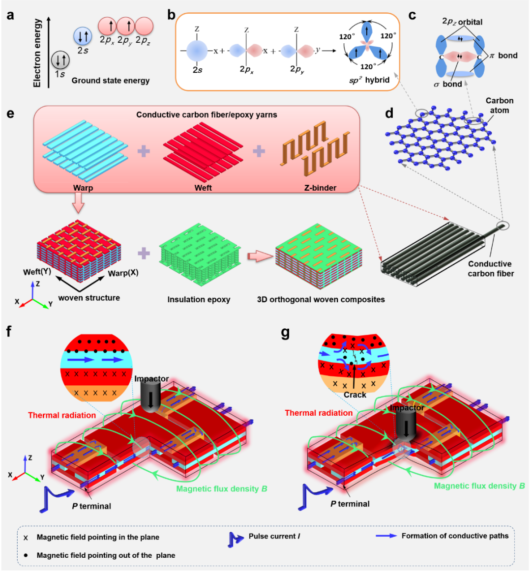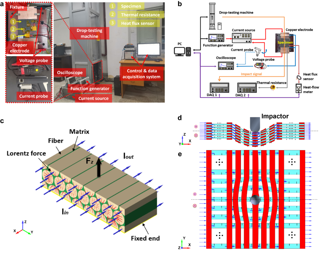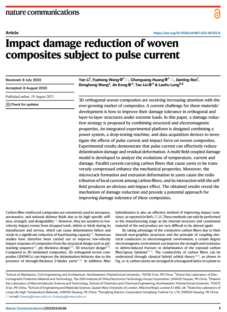 北京时间2023年8月19日,西北工业大学力学与土木建筑学院王富生教授团队在《自然•通讯》(Nature Communications)杂志在线发表题为《脉冲电流下编织复合材料抗冲击损伤》(Impact damage reduction of woven composites subject to pulse current)的研究论文。该研究提出了一种采用脉冲电流来改善三维正交编织复合材料抗冲击性能的方法,并系统揭示了脉冲电流对正交编织复合材料冲击损伤的抑制机理。 西北工业大学博士生李妍为该文第一作者,西北工业大学王富生教授和黄晨光副教授为共同通讯作者,西北工业大学任建亭教授、中国电子科技集团公司第三十三研究所王东红研究员、西北工业大学孔杰教授、伦敦玛丽女王大学刘涛副教授、中国东方电气集团有限公司龙老虎高工为共同作者。 航空、航天和土木等工程领域中,碳纤维/环氧树脂基复合材料受到冲击载荷容易出现纤维断裂、树脂破坏和分层等损伤形式,降低复合材料的承载能力,对飞行器和土木工程等结构的安全带来威胁。关于提升复合材料抗冲击性能的方法多从材料改性、结构设计和制造工艺等方面考虑,如相较于层合复合材料,编织复合材料在抑制冲击损伤方面具有独特优势。然而,这些方法对改善复合材料的抗冲击性能仍存在局限性,如何进一步提高冲击载荷下复合材料的损伤容限仍是复合材料理论研究中所面临的重要难题之一。 针对这一难题,王富生教授团队与合作者将编织物的结构特性和碳纤维的电磁特性相结合,提出了一种降低三维正交编织复合材料冲击损伤的策略。利用无线通信技术,设计搭建了落锤冲击试验机、电流源和数据采集设备等一体集成的实验平台,实现了脉冲电流和冲击力对正交编织复合材料的协同加载。研究结果表明,随着脉冲电流峰值从0 A增加到110 A,三维正交编织复合材料板的非弹性能量和残余变形分别减少了35.81%和47.64%。多尺度多物理场建模分析表明,载流碳纤维使得纱线束受到了横向压缩性质的电磁体力,有利于提升纱线的机械性能;纱线中微裂纹的形成和挤压变形会引起碳纤维之间局部电流的重新分布,其与自场相互作用会产生抗冲击效应。基于材料-结构-功能的一体化设计思想,有效控制脉冲电流对复合材料热效应的影响,此项研究成果可以为提高复合材料在冲击载荷下的损伤容限提供新的途径。 图1 三维正交编织复合材料结构的导电机理与冲击前后的电-磁-力-热耦合示意图 图2 设计搭建的一体化实验平台和三维正交编织复合材料在脉冲电流作用下的冲击损伤抑制机理 该研究工作得到了国家自然科学基金(51875463和52175147)、航空科学基金(20200044053002)、山西省科技创新团队专项基金(202204051001001)和长寿命高温材料国家重点实验室基金(DTCC28EE200788)等项目的资助。该研究工作依托于西北工业大学力学与土木建筑学院“装备和设施工程设计与防护研究所”的科研力量,研究所拥有一支高素质师资队伍,近年来取得了丰硕成果。在王富生教授的带领下,研究所立足西工大“三航”特色,瞄准“卡脖子”科学技术难题。研究所加强基础理论创新和工程实践,重点突破极端环境下装备和设施工程安全评估的基础科学难题,形成装备和设施工程防护设计的新理念。 王富生教授与团队部分成员在一起