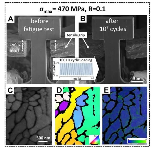 图3、原位微纳疲劳测试:(A)疲劳测试前的微米级疲劳样品表征,(B)在最大应力470 MPa下进行了107个加载循环后的样品表征,(C-E)疲劳测试后样品的TKD表征结果,硅网络保持完整,样品内未出现明显应变集中
