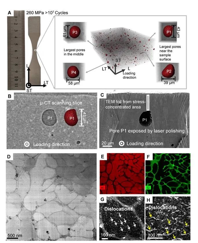 图4、高抗疲劳亚微米共晶网络结构:(A)通过疲劳极限测试的样品内未出现明显裂纹;(B-C)通过 μ-CT 引导激光定位切削至近样品表面的孔洞;(D-H)孔洞周围的亚微米共晶网络基本保持完整,位错运动被限制在网络结构内部