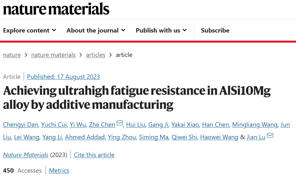 近日,上海交通大学材料科学与工程学院王浩伟教授团队在抗疲劳3D打印铝合金方向取得重要突破,相关成果发表在国际著名学术期刊Nature Materials,题为 “Achieving Ultrahigh Fatigue-Resistant AlSi10Mg Alloys by Additive Manufacturing” ,该工作与香港城市大学吕坚院士团队合作完成。
