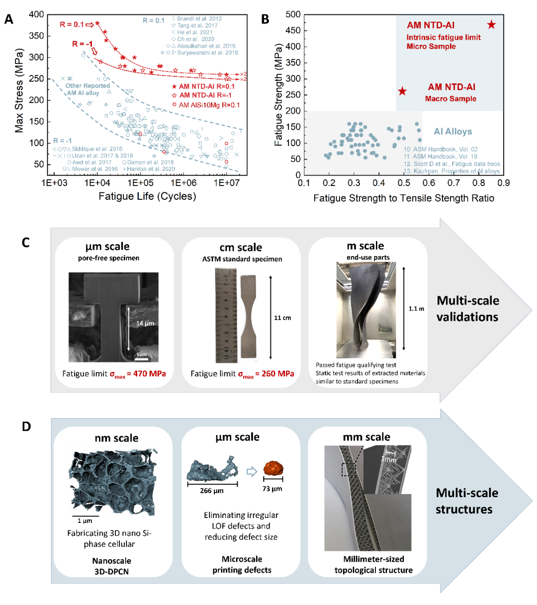 图1、高抗疲劳3D打印AlSi10Mg合金:(A)优化后3D打印AlSi10Mg合金疲劳强度为其他3D打印铝合金的两倍,(B)同时超过了传统高强铝合金;(C)3D打印AlSi10Mg合金的跨尺度疲劳性能验证;(D)3D打印AlSi10Mg合金的跨尺度结构设计与优化