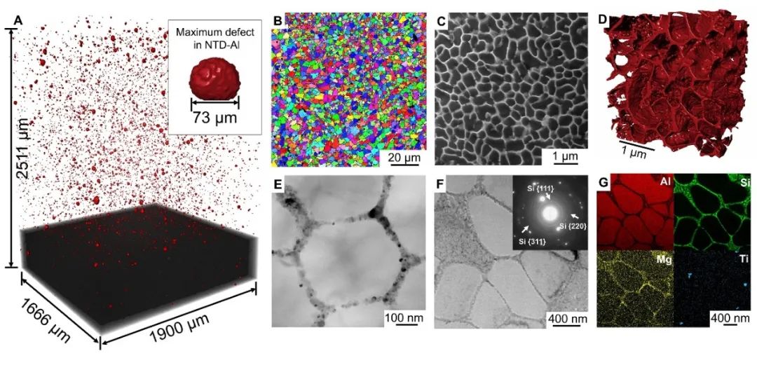 图2、高抗疲劳3D打印AlSi10Mg合金的微观结构。(A)μ-CT结果显示打印缺陷均为球型,其中最大的缺陷测量为73微米,约为不含TiB2颗粒AlSi10Mg合金中LOF缺陷的1/3,(B)打印样品的晶粒形态,(C-F)平均直径约为~500纳米的共晶硅网络结构,( G)Al、Si、Mg和Ti四种元素分布