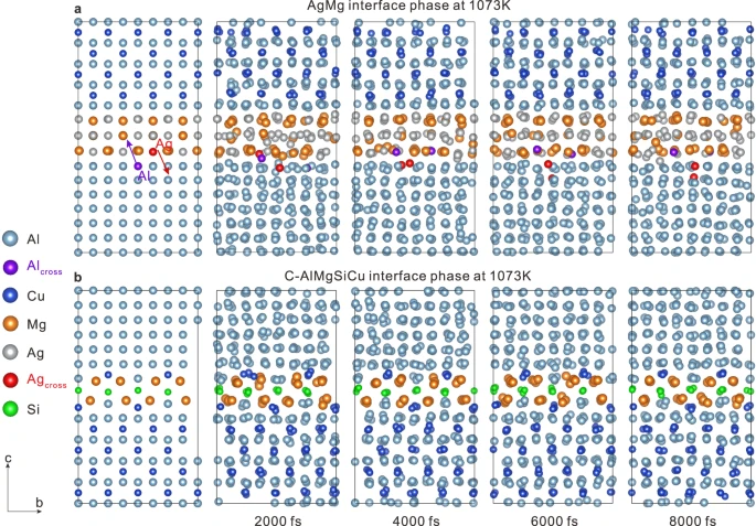 图7为1073 K下不同界面相的AIMD计算结果。a为χ-AgMg界面相的AIMD计算结果。b为C-AlMgSiCu界面相的AIMD计算结果。穿过层的Ag和Al原子分别用红色和紫色标记。