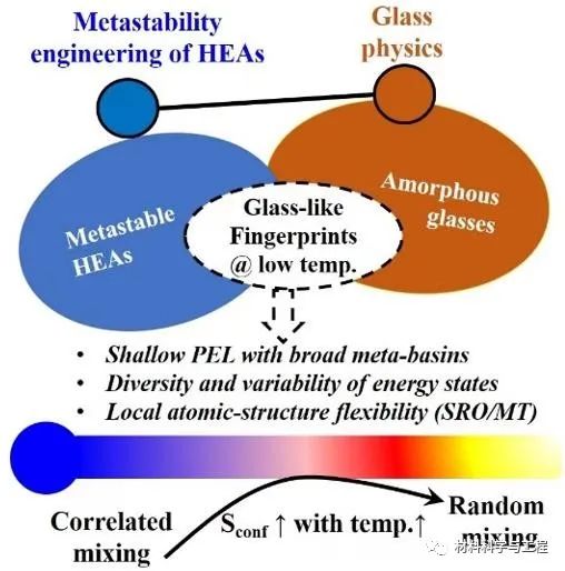 图1:非晶物理和亚稳高熵合金之间的内在关联性示意图:高熵合金在高温下呈现出高熵稳定的无序混合固溶体特性,但在低温下呈现出类玻璃的特征,比如,浅势能面和宽的能谷、能态多样性和可变性、局部原子结构的灵活性(发生短程有序化和马氏体相变等转变)。
