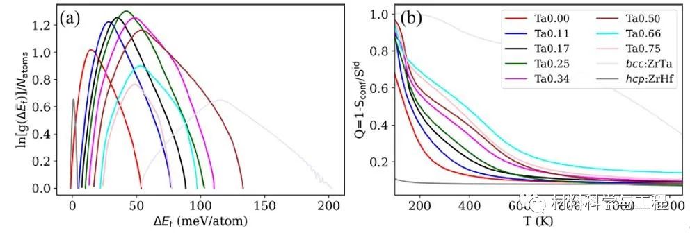 图6(a)构型态密度和(b)构型熵与理想混合熵偏差程度随Ta含量的变化情况。这里也与ZrHf(hcp),ZrTa(bcc)合金进行了对比分析。