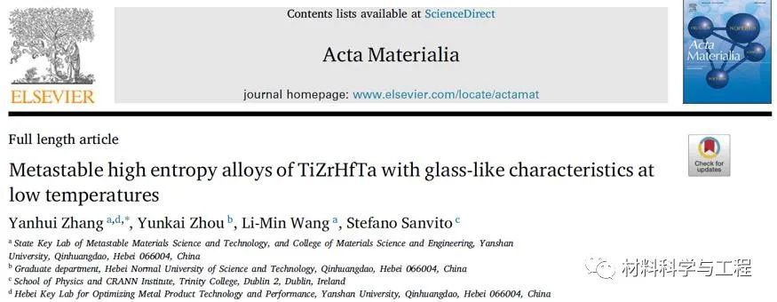 为了更好地理解结构材料的亚稳特性并其优化力学性能,燕山大学材料学院张宴会老师及其合作者,采用多种先进的结构搜索技术,探索了典型耐高温体系Ti-Zr-Hf-Ta庞大的构型空间和复杂的能量空间。相关工作得到国家自然科学基金,河北省自然科学基金、河北省教育厅、河北省金属产品工艺及性能优化控制重点实验室、爱尔兰研究委员会等的资助。论文以“Metastable high entropy alloys of TiZrHfTa with glass-like characteristics at low temperatures”发表在金属材料领域顶级期刊Acta Materialia,作者为张宴会,周云凯,王利民,Stefano Sanvito。张宴会老师是该论文的通讯兼第一作者。