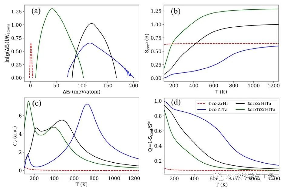 图4 基于Wang-Lauda蒙特卡洛采样和集团展开开展ZrHf(hcp),ZrTa(bcc),ZrHfTa(bcc)和TiZrHfTa(bcc)合金的热力学学对比分析:(a)构型态密度,(b)构型熵,(c)构型潜热,(d)构型熵与理想混合熵的偏差程度