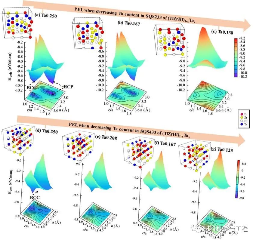 图2 (TiZrHf)1-xTax势能面的3D和2D投影图(以晶格常数a和轴比c/a为参数构建)。(a~c)为包含36个原子的SQS超胞模拟结果,Ta含量分别为0.250,0.167,0.138。图(d~f)为包含72个原子的SQS超胞模拟结果,Ta含量分别为0.250,0.208,0.167,0.125。