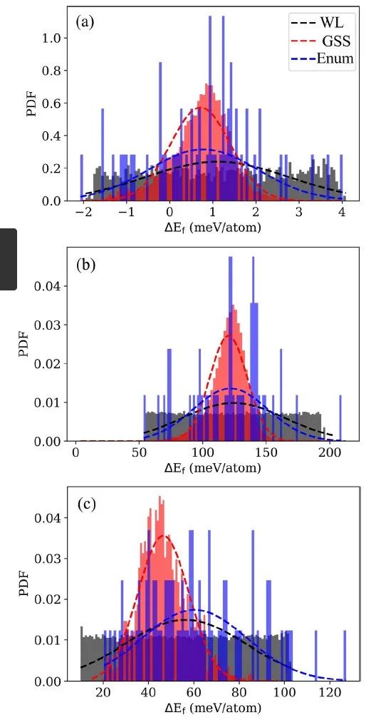 图3 等摩尔比合金的形成能分布图(a)hcp ZrHf,(b)bcc ZrTa,(c)bcc TiZrHfTa。对于每组合金而言,使用了三种不同的结构采样方法:枚举非等价的超胞法,基态全局搜索法和Wang-Landau加速采样法