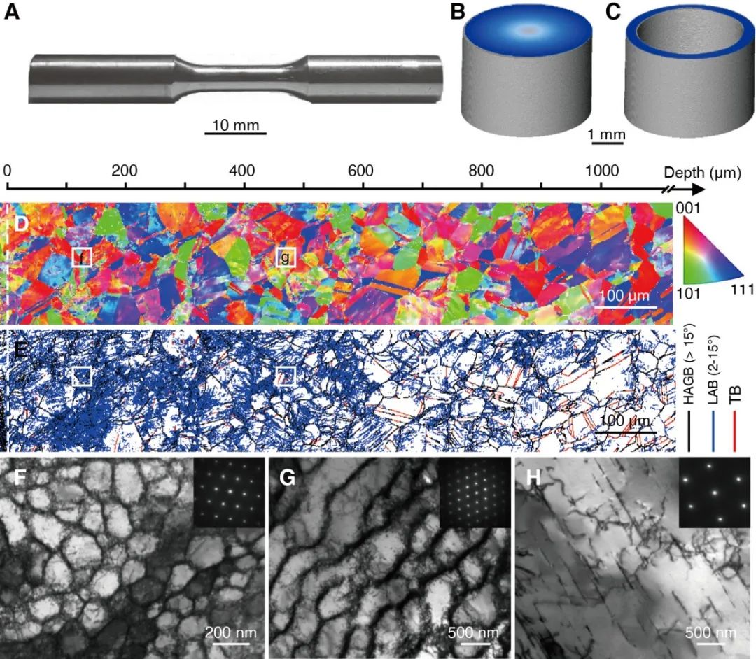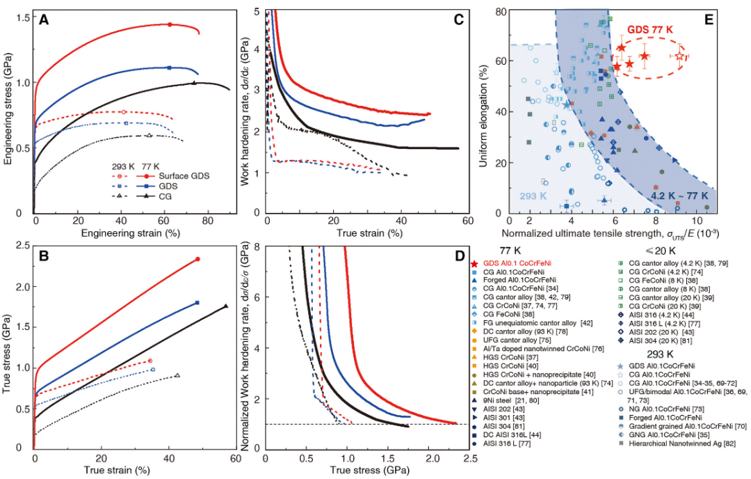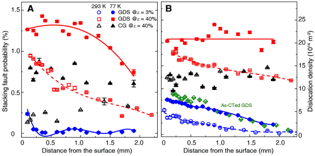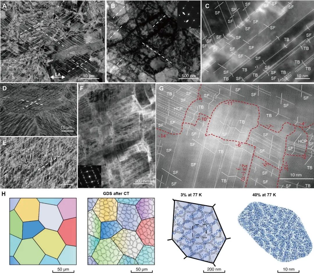 卢磊。她不仅是中科院金属研究所的知名研究员,还担任博士生导师,指导后辈科研工作者。而且,她还获得了中科院人才计划、国家杰出青年科学基金、国家级人才计划等多项荣誉。她的成就得到了国家级别的认可。 卢磊的研究成果和才能不仅仅局限在学术领域。她还是科技部“纳米科技”重点专项总体专家组成员,这一身份体现了她在纳米科技领域的重要地位。 卢磊的才华和贡献得到了辽宁省的认可,她被授予“兴辽计划”创新领军人才这一荣誉,这充分体现了她在辽宁省科技创新中的重要地位。作为全球纳米材料和材料强度领域的领军人物之一,卢磊现担任国际委员会委员,并在Acta Materialia和Scripta Materialia等知名期刊担任编辑。她的主要研究方向集中在纳米结构金属材料的制备、力学性能以及变形机理方面,具有极高的学术价值。至今,她已经发表了110余篇SCI论文,其中包括4篇Science和2篇Nature,这些文章被引用次数已经超过了15000次,彰显了她在该领域的国际影响力。此外,她还拥有15项国内发明专利和6项国际发明专利,为推动科学技术发展做出了重要贡献。 在过去的几年里,她在国际学术会议上多次发表了大会、主题和邀请报告,总计达70余次,展示了她在学术界的地位和卓越的学术能力。这些成果和荣誉是对她辛勤工作和卓越成就的充分肯定,也是对她在纳米材料和材料强度领域的卓越贡献的认可。卢磊研究员的团队致力于研究块体纳米结构金属材料,从样品制备到微观结构表征,再到结构稳定性和综合力学性能,最后到理化性能的评估。他们的目标不仅仅是理解这些材料的性能,更是通过深入探究它们的结构与性能之间的关系,来揭示纳米结构金属材料背后的强韧化原理和极致性能的根源。"令人惊叹的是,卢磊研究员的二哥竟然是著名的卢柯院士,这两位学霸兄弟在《Nature》和《Science》上崭露头角!而今天,卢磊教授的最新研究成果更是荣登《Science》杂志。那么,接下来就让我们一起深入了解这篇重磅论文,共同感受其中的奥秘与魅力吧!"应变硬化,也被称作加工硬化,可以追溯到古老的青铜时代,它也是最早被广泛应用在金属材料强化策略中的方法。这个传统方法主要是通过增加典型线性缺陷(也就是位错)的数量以及它们在晶格中的相互影响来实现的。随着位错数量的增加,位错流动性逐渐降低,从而需要施加更大的应力才能使其发生额外的变形。 一般来说,像软质粗粒(CG)金属这种应变硬化程度最高的材料,往往也具有最好的拉伸延展性。这主要是因为位错在这些材料中有丰富的空间,并且可以自由移动和存储,因此它们能够产生最大的自由移动和存储路径。 在结晶固体中,位错与位错之间的相互作用会产生局部位错缠结的现象。这种缠结最终会形成三维网络的位错图案,导致进一步的变形变得非常困难。这些成果将有助于推动相关领域的研究,并且可以为新的材料和加工技术的发展提供基础支撑。在此,中科院金属所卢磊教授团队的实验报告为我们揭示了一个奇妙的现象:在77开尔文条件下,一种具有梯度位错单元的稳定单相合金在整个变形阶段的应变硬化率竟然超过了粗晶粒材料。这一发现颠覆了我们的传统认知,因为这种特殊的应变硬化竟然源于一种独特的动态结构细化机制。 这种机制相当独特,它是由大量多方向微小堆积断层的发射和运动所促成的,与传统的线性位错介导变形有着天壤之别。更令人惊讶的是,原子尺度的平面形变断层在塑性变形中占主导地位,这为金属材料的强化和硬化提供了一种全新的方法。这一重大发现具有深远的影响,它不仅为我们提供了一种全新的金属材料强化和硬化方法,还预示着梯度细胞结构合金在潜在应用方面可能具有出色的性能。相关成果以“Atomic faulting induced exceptional cryogenic strain hardening in gradient cell–structured alloy”为题发表在《Science》上,第一作者为潘庆松研究员。"CG Al0.1CoCrFeNi MPE合金样品在初始状态下,其晶粒结构呈随机取向,平均尺寸约为46微米。然而,通过常温下的循环扭转(CT)处理,试样的微观结构发生了显著变化,形成了试样级分层GDS结构。这种结构在量规截面上呈现出明显的不同,初始的随机取向晶粒结构保持不变,从GDS样品的表面到核心都呈现出均匀分布的特点。 特别值得注意的是,在晶粒内部引入了大量的低角度边界,这些边界在空间上呈随机分布状态。从样品的顶部开始,随着深度的增加,低角度边界的密度逐渐降低。这种低角度边界的存在,可能是由于在处理过程中,试样经历了循环扭转的作用力,导致晶粒之间的相对位置发生了变化。 通过透射电子显微镜观察发现,在最顶部的晶粒中形成了丰富的等轴差排位错胞,这些错胞的平均错向约为2度。此外,作者还测量到位错胞的直径在顶面约为200纳米,而到了0.45毫米深处逐渐增加到约350纳米。这种变化可能是由于在循环扭转处理过程中,试样内部的应力和应变导致了晶粒之间的相对位置变化,进而形成了不同尺寸的等轴差排位错胞。"在准静态单轴拉伸试验中,图2A的工程应力应变曲线和图2B的真实应力应变曲线均显示,当温度从293 K降低到77 K时,GDS样品的强度和延展性出现了显著的提升。令人惊讶的是,在77 K时,块状GDS样品的真实屈服强度约为0.7 GPa,真实极限抗拉强度超过1.8 GPa,这比CG样品的表现好了许多。此外,图2B还发现,在77 K