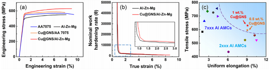 图3 (a)复合材料的工程应力-应变曲线;(b)复合材料的加工硬化率曲线;(c)Cu@GNS/Al-Zn-Mg复合材料与已有文献报道的复合材料的力学性能对比。
