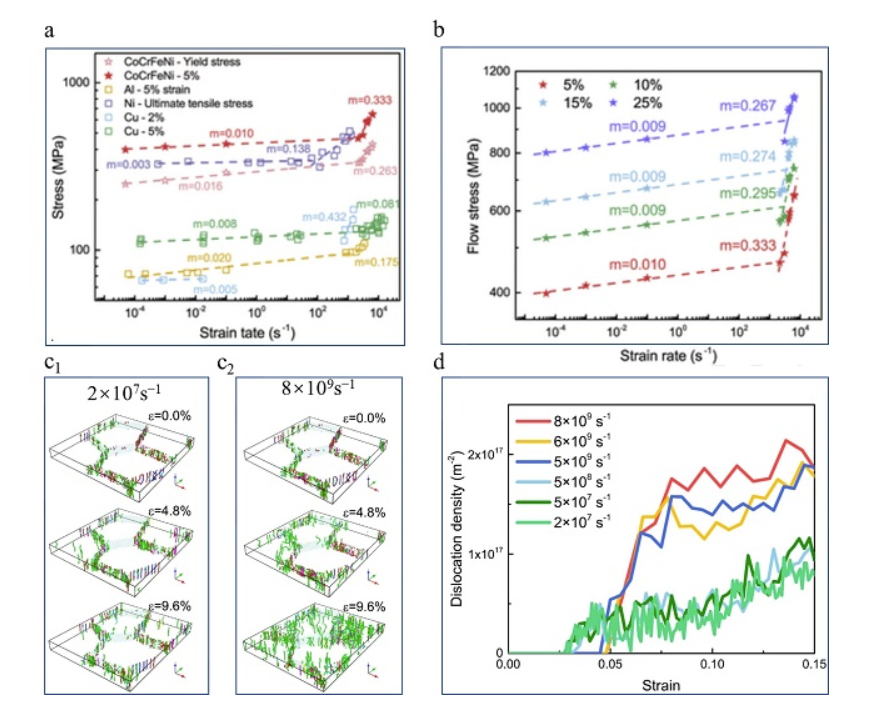 图1.(a-b)CoCrFeNi高熵合金应变率强化作用在高应变率下发生量级上的突变;(c-d)高应变率下位错快速增值,且在屈服附近发生突增