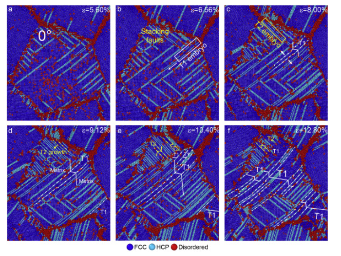 图5 在应变速率为8×109 s-1的形变试样中形成层次孪晶。(a)晶界位错发射。(b-c)初生孪晶的形核和生长(T1)。(d-e)次生孪晶的形核和生长(T2)。(f)初级和次级孪晶之间的相互作用。白色和黄色分别代表主孪晶和次孪晶。