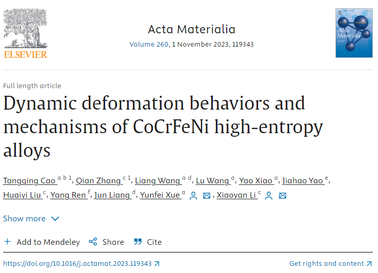 近日,北京理工大学材料学院薛云飞教授联合清华大学航天航空学院李晓雁教授等在金属材料领域顶级期刊《Acta Materialia》发表了题为“Dynamic deformation behaviors and mechanisms of CoCrFeNi high-entropy alloys”的研究论文。北京理工大学为第一完成单位,北京理工大学曹堂清博士和清华大学张倩博士为共同第一作者,薛云飞教授和李晓雁教授为论文共同通讯作者。