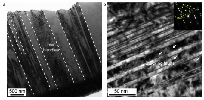 图3 CoCrFeNi HEA的应变率为28.8%,应变率为4.5×103 s - 1。(a, b)变形HEA中的双束。(b)中的插图显示了孪晶结构的选定区域电子衍射图。