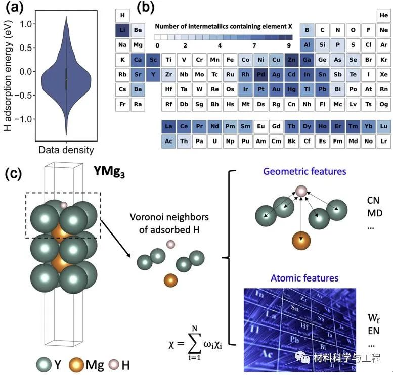 图2. (a) 初始数据集中氢吸附能分布。(b) 含有元素X的金属间化合物的数量。白色框表示在材料数据库中没有找到稳定或半稳定的金属间化合物 ()。 (c) 从氢吸附构型中提取几何特征和化学特征的方法。以YMg3为例,首先通过Voronoi分析提取了氢原子局部吸附环境,即氢原子和其周围的Voronoi邻居。然后,基于Voronoi多面体的几何形态计算局部吸附环境的几何特征。通过对每个Voronoi邻居元素特征的加权求和计算局部吸附环境的化学特征。权重根据Voronoi多面体的立体角获得。