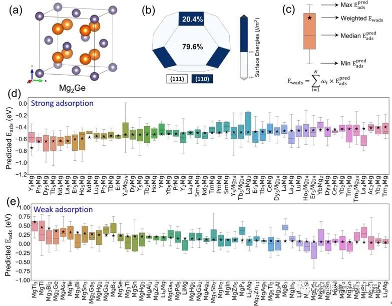 图6.筛选出的能够抑制镁合金电偶腐蚀阴极析氢反应的二元析出相。以Mg2Ge为例,说明如何评估某一析出相对镁合金阴极腐蚀反应的抑制能力。(a) Mg2Ge单胞,其中橙色代表Mg原子,紫色代表Ge原子。 (b) Mg2Ge晶体的Wulff多面体。其表面能量单位为J/m2,而百分数表示各个晶面的占比。 (c) 针对析出相的不同表面及吸附位置,XGBoost预测了其吸附能范围。这些析出相按照加权吸附能进行排序(用黑色星形表示)。(d)前50种氢吸附能力较强的金属间化合物。 (e) 前50种氢吸附能力较弱的金属间化合物。