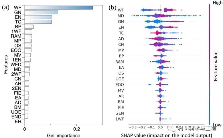 图4. (a) 从XGBoost算法中获得的基于Gini重要性的特征排序。 (b) 通过SHAP获得的特征重要性排序。