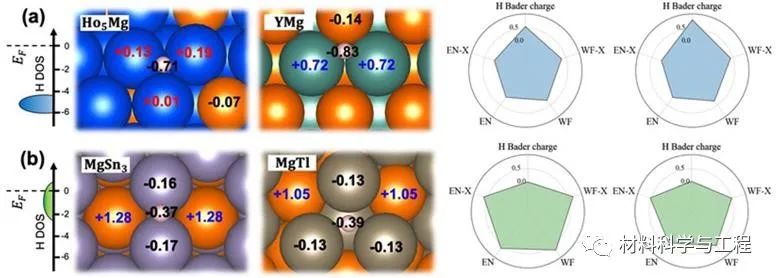 图5. (a) 氢强吸附表面和 (b) 氢弱吸附表面的Bader电荷分析和表面属性。左侧子图是吸附氢的电子态密度的示意图。右侧子图的EN-X和WF-X分别是二元镁金属间化合物中第二钟元素的电负性和功函数。EN和WF是氢原子Voronoi邻居的加权平均电负性和功函数。所有属性都进行了0-1归一化。