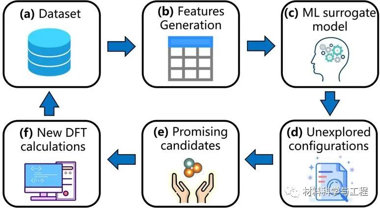图1. 一个用于加速发现可抑制镁合金电偶腐蚀析出相的主动学习设计框架的示意图。(a) 原始数据集。(b) 根据Voronoi多面体从初始吸附构型中提取了氢原子的吸附特征,其中包括几何和化学特征。(c) 基于输入特征训练机器学习迭代模型。(d) 使用pymatgen生成镁二元析出相的吸附构型。(e) 使用机器学习模型预测轻吸附能,选取了具有高或低吸附能的候选者。(f) 根据预测结果,进行了新的DFT计算,并将获得的氢媳妇能添加到数据集中。