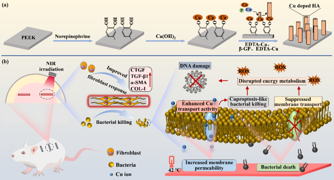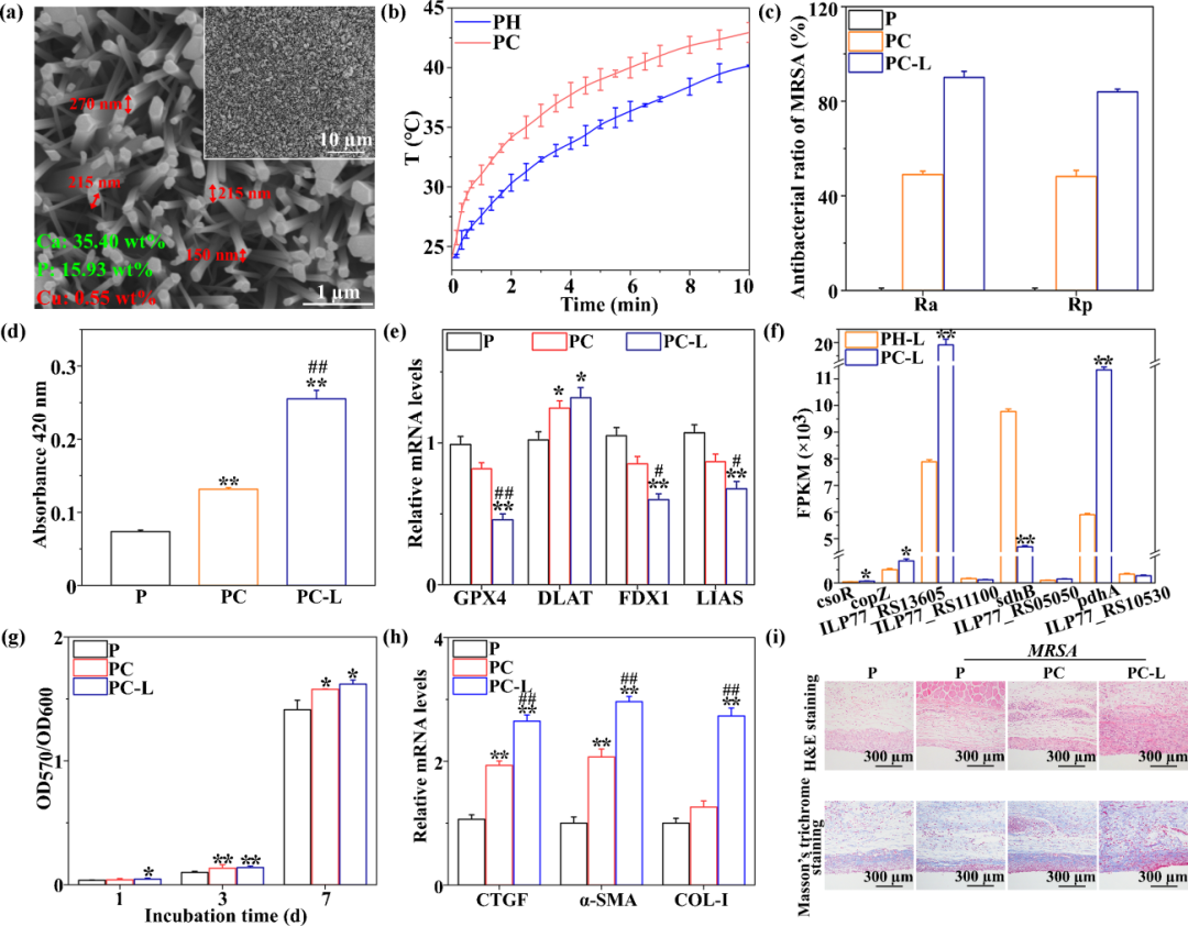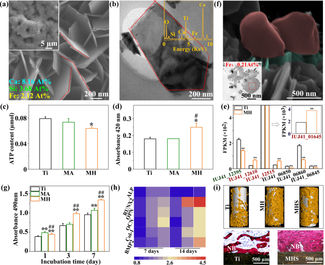 铁、铜是所有生物体必需的微量元素,是诸多生物过程的基础元素。研究发现铁、铜的胞内富集可引发肿瘤细胞铁死亡或铜死亡,在抑制癌症发展中起到关键作用。铁死亡是由于胞内铁过载、活性氧依赖的脂质过氧化物累积及谷胱甘肽耗竭引起的肿瘤细胞死亡;铜死亡是通过铜与三羧酸循环的脂化组分直接结合,引发脂酰化蛋白聚集、铁硫蛋白损失及蛋白毒性应激导致的肿瘤细胞死亡。铁、铜离子具有剂量依赖的抗菌活性和细胞毒性,那么生物安全剂量下的铁、铜离子是否能诱导细菌发生铁死亡或铜死亡,微环境刺激(如pH改变、光热刺激等)能否促进细菌对离子的摄入,加速细菌发生铁死亡、铜死亡尚未可知。 针对上述问题,西安交通大学金属材料强度国家重点实验室的研究人员在钛种植体表面制备了铁掺杂的硅酸钛钙“纳米剑”,在聚醚醚酮(PEEK)表面制备了铜掺杂的羟基磷灰石“纳米棒”。研究表明,“纳米剑”的降解引起局部pH值升高,削弱了金黄色葡萄球菌的质子动力,减少了细菌ATP的合成,降低了细菌膜模量,细菌胞膜在“纳米剑”作用下发生扭曲甚至被刺穿,导致胞内物质泄漏。同时,由于细菌膜通透性增加,细菌摄入了过多的铁离子,出现胞内铁富集、脂质过氧化和谷胱甘肽耗竭等铁死亡现象。重要的是,由于细菌、细胞对微环境响应存在差异性,“纳米剑”在有效清除种植体表面入侵细菌的同时,改善了成骨细胞响应及骨整合,在临床感染种植体的治疗中具有广阔的应用前景。相关成果以“Alkaline Nanoswords Coordinate Ferroptosis-like Bacterial Death for Antibiosis and Osseointegration”为题发表在ACS Nano杂志上。 图1. 钛种植体表面铁掺杂硅酸钛钙“纳米剑”的制备流程图及其抗菌与骨整合 图2. (a)“纳米剑”的SEM形貌和(b)TEM形貌;试样表面培养1天后金黄色葡萄球菌的(c)ATP合成量,(d)胞膜通透性,(e)与铁死亡相关的差异基因表达,和(f)形貌;(g)MTT法检测试样表面培养1、3、7天的成骨细胞活力;(h)试样表面培养7、14天后成骨细胞ALP、RUNX2、OPN、OCN、Col-1和BMP2的表达;(i)试样植入大鼠松质骨内6周后Micro-CT图像及VG染色结果。*: p < 0.05和**: p < 0.01与Ti相比;#: p < 0.05和##: p < 0.01与MA相比。 针对耐甲氧西林金黄色葡萄球菌(MRSA)对多种抗生素具有耐药性,严重威胁人类健康这个问题,研究人员探究了近红外照射下铜掺杂羟基磷灰石“纳米棒”的抗感染,提高组织整合的性能。研究表明,温和的光热刺激增加了细菌膜的通透性,加速了铜离子的摄入,导致了细菌的二氢脂酰胺s-乙酰转铁酶聚集、谷胱甘肽过氧化物4失活以及铁氧还蛋白和脂酰合成酶的不稳定等,引发了包括 MRSA、大肠杆菌和金黄色葡萄球菌在内的细菌发生铜死亡。在近红外照射下,成纤维细胞响应有所上调,种植体表面软组织整合有所改善,这种多功能涂层复合光热的治疗策略在提高PEEK临床性能方面具有很大的应用前景。相关成果以“Low-Dose Cu Ions Assisted by Mild Thermal Stimulus Inducing Bacterial Cuproptosis-Like Death for Antibiosis and Biointegration”为题发表在Advanced Functional Materials杂志上。 图3. 聚醚醚酮表面铜掺杂羟基磷灰石“纳米棒”的制备及其抗菌与软组织整合 图4. (a)“纳米棒”的SEM形貌;(b)试样的光热响应;试样表面培养1天后耐甲氧西林金黄色葡萄球菌的(c)抗菌率,(d)胞膜通透性,(e)与铜死亡相关的差异基因表达,(f)与铜转运、铜死亡相关的差异基因表达;(g)Alamar Blue法检测试样表面培养1、3、7天的成纤维细胞活力;(h)试样表面培养7天后成纤维细胞CTGF、α-SMA和Col-1的表达;(i)试样植入大鼠皮下7天后H&E和Masson’s trichrome staining图像。*: p < 0.05和**: p < 0.01与P相比;#: p < 0.05和##: p < 0.01与PC相比。 西安交通大学张兰教授和憨勇教授为论文的共同通讯作者,西安交通大学博士薛阳为论文的第一作者。该研究得到了国家自然科学基金委面上项目、陕西省杰出青年基金、陕西省自然科学基础研究计划项目重点基金等项目的支持。 论文链接: https://doi.org/10.1021/acsnano.2c10960 https://doi.org/10.1002/adfm.202308197