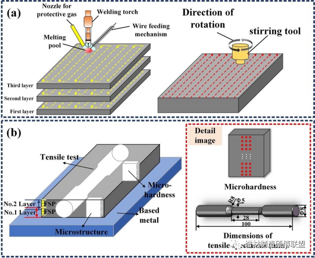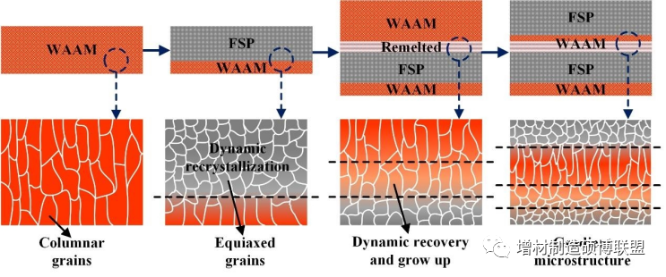 此外,还可以采用梯度微观结构设计,实现强度和延性的同步提高。通过制备从超细晶粒到常规晶粒的连续梯度过渡微观结构,该材料具有更好的强塑性匹配、抗裂性和疲劳性能。因此,本文提出了将WAAM和FSP相结合的新型复合增材制造方法来制造梯度微观结构2319合金,探讨了层间FSP处理在形成特征微观结构中的作用。