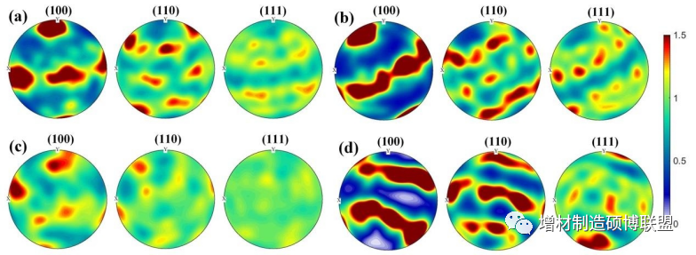 图3 试样在不同区域的平均晶粒尺寸和晶粒尺寸长径比统计分布为了检验不同区域的晶粒取向和局部纹理,提取定性分析和极点图进行比较,如图4所示。在同一区域内,织构强度随方向变化明显,(100)方向的强度高于(111)方向。然而,不同区域的织构强度存在显著差异。DZ的织构最强,最大值为1.5,最小值为0.6。这是由于WAAM的温度梯度较高,导致对(100)有很强的优先取向。另一方面,层间区的织构强度相对较低。在F/DZ中,由于塑性变形,织构强度降低。此外,在D/FZ中,织构取向均匀,由于存在大量随机取向的再结晶晶粒,织构取向几乎不存在各向异性。这些梯度界面的各向同性通常增强了延性。在图4(d)中,FZ区域的等轴晶粒是通过摩擦搅拌引起的强烈塑性变形获得的,从而在特定方向上增强了织构。从图4(b)中可以看出,在WAAM的形成过程中,容易形成粗柱状晶粒,导致各向异性明显。相反,在图4(a, c)中,晶粒经历了重熔,随后降低了织构的强度。然而,它们尚未达到粗柱状晶粒的水平,因此与其他两个区域相比,它们的织构强度较低。