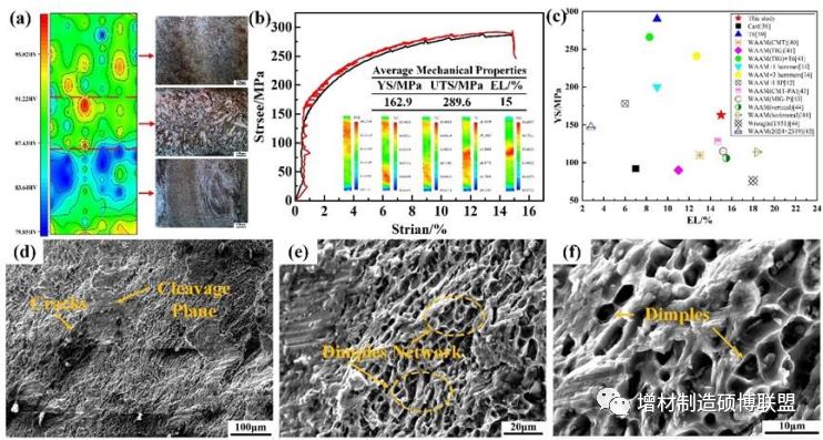 图5 试样不同区域的晶粒类型、百分比及高角度晶界图为了探索梯度结构对力学性能的影响,对样品的不同区域进行了显微硬度测试。制备样品的显微硬度分布如图6(a)所示。HAM2319合金的平均显微硬度约为88 HV,比WAAM 2319合金的75 HV显著提高了17.5%。但微观组织对各区域显微硬度的影响是不同的。样品的底部区域相对不受热循环的影响,具有较高的显微硬度(92 HV)。另一方面,由于中间沉积区存在较大的晶粒,该区域的显微硬度较低(85 HV)。由于热循环作用,第二层搅拌区比第一层搅拌区具有更高的显微硬度(90 HV)。为了研究梯度显微组织与拉伸性能之间的关系,进行了拉伸试验和数字图像相关(DIC)实验,如图6(b)所示。结果表明:复合材料的平均屈服强度(YS)为162.9 MPa,平均极限抗拉强度(UTS)为189.6 MPa,伸长率(EL)为15%。与WAAM试样相比,HAM试样的力学性能得到了提高。拉伸曲线的弹性阶段表现出抖动行为,称为Portevin-Le Chatelier (PLC)效应,这是在拉伸过程中由于位错运动和溶质原子之间的相互作用而动态发生的聚集现象。为了得到完整的拉伸应变,加载试样的现场照片通过DIC采集。应变集中区的红色部分表示破裂部位,突出了由梯度微观结构引起的非均匀塑性变形。图6(c)为HAM合金与单一WAAM及其他方法的力学性能对比。值得注意的是,WAAM和EL的YS分别为110MPa和13%。相比之下,T6状态的YS为266 MPa, EL为8.3%。因此,HAM试样的YS是WAAM的1.5倍,伸长率是T6的2倍。另一种HAM技术,激光冲击强化的YS为178.3MPa, EL为6%。层间损伤的YS为200MPa, EL为9%。值得注意的是,大多数其他混合增材制造技术无法协同实现强度和延性增强。因此,WAAM/FSP比其他方法更有优势。因此,与其他方法相比,WAAM/FSP具有更强的优势。图6(d-f)为试样的断口形貌。断口表面呈现纤维区和剪切唇,这是韧性断裂的明显特征。从高倍图像中可以明显看出,断口表面有大量均匀分布的韧窝,主要的等轴韧窝形成网状结构。深而大的韧窝具有较高的延展性,表明复合增材制造样品具有良好的伸长率。