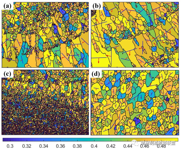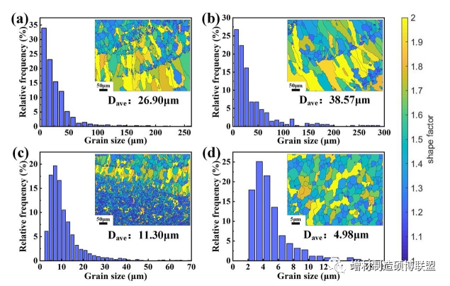 图3为晶粒尺寸的变化规律和形状因子的统计分布。区域1# ~ 4#的平均晶粒尺寸分别为26.90µm、38.57µm、11.30µm和4.98µm。DZ和FZ之间显著降低了87.09%,这是由于足够的过冷和较小的温度梯度。此外,DZ的形状因子为1.64,FZ的形状因子为1.28。这表明FSP可以将粗柱状晶粒转变为细化的等轴晶粒。此外,D/FZ的晶粒尺寸和形状因子低于F/DZ,这进一步证明了搅拌后底部的晶粒在几次FSP后没有过度生长。即使受到来自WAAM的热输入,晶粒仍将保持其优越的形貌和尺寸。