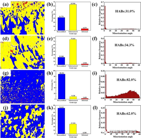 图5显示了四个区域的各种晶粒类型,包括再结晶、亚结构和变形晶粒,分别用蓝色、黄色和红色标记。每种类型的百分比用柱状图表示,以便更清楚地了解数据。通过对图表的分析发现,亚结构颗粒在DZ中占多数(75.26%)。F/DZ的再结晶和变形晶粒比例略有增加,分别达到31.78%和4.28%,这是由于剧烈的塑性变形造成的。此外,WAAM产生的热循环导致再结晶晶粒百分比增加了88.20%,亚结构晶粒百分比在D/FZ中减少到9.14%。FZ的再结晶晶粒比例较高(72.22%),其次是亚结构晶粒(27.39%)。数据表明,一些晶粒在经过一次摩擦搅拌后仍未再结晶。