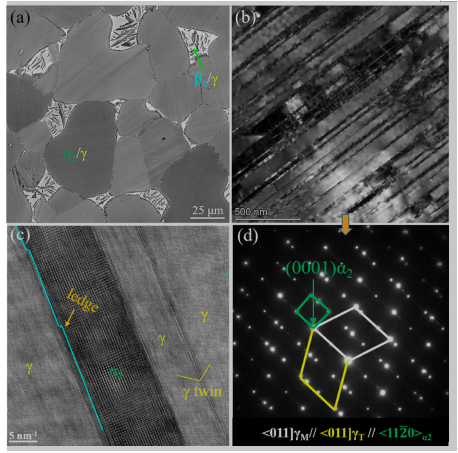 图1 .通过SEM的BSE模式和TEM对LM进行了表征。( a ) BSE图像显示LM由α2 /γ集束和β0 /γ区域组成。( b ) Bf-Tem Micrograph;( c ) HRTEM图像显示α2 /γ片层具有共格和台阶状的界面以及γ/γ孪晶。( d ) SAED证实了α2 /γ片层之间的Blackburn OR和γ片层的孪晶对称性。