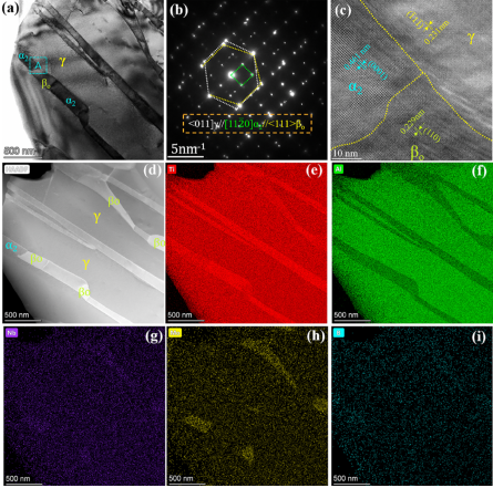 图3 . PM的TEM表征。( a ) BF - TEM图像。( b ) ( a )中A区的SEAD图表明了三个阶段之间的Blackburn,Burgers和Kurdjumov - Sachs OR。( c ) ( a )中A区的HRTEM显示了它们之间的半共格界面。( D ) Haadf图像。( e )┐( i ) Ti,Al,Nb,Mo和B的元素映射。