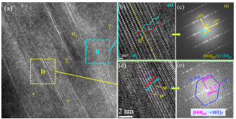 图6 . 750°C时较薄γ片层的变形机制。( a ) HRTEM显示LPSO结构在γ/γ孪晶界和α2 /γ片层界面均有形成。( b ) ( a )中放大的B区域显示了6H堆积序列。( c ) ( b )的FFT模式。( d ) ( a )中的Magnified D区域表示9R堆叠序列。( e ) ( d )的FFT模式。