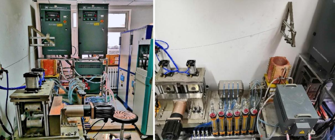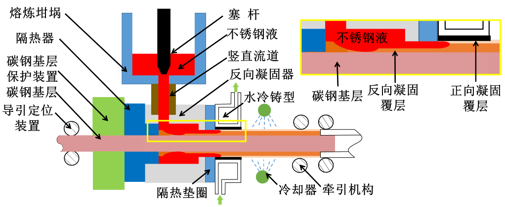 不锈钢具有良好的耐腐蚀性、较高的塑性和韧性,广泛应用于海洋工程、建筑装饰、交通运输、石油化工、国防军工和日常生活等领域。然而,不锈钢中Cr、Ni、Mo等贵重金属元素的添加导致其成本较碳钢显著提高,这也限制了不锈钢在更广泛领域的推广应用。金属层状复合材料兼具了多种金属材料的优异性能,能够实现结构和功能的一体化设计,同时可以节省贵重金属材料的用量,大幅降低成本。因此,以不锈钢作为基层的金属层状复合材料在具备不锈钢优异性能的同时可以进一步降低成本(如不锈钢/碳钢层状复合材料)或满足不同耐腐蚀环境(钛/不锈钢层状复合材料),可以作为不锈钢材料的替代品满足更多领域的应用需求,具有广泛的应用前景和市场。目前,工业化生产中普遍采用爆炸+轧制或真空热轧复合的方法成形不锈钢基层状复合材料,但爆炸复合环境不友好、生产效率低、产品尺寸规格受限,因此逐步被真空热轧复合技术所替代。真空热轧复合技术采用成形的板材为原料,首先需要进行基层和覆层的表面处理、组坯、焊接、抽真空等工序,工艺繁杂且流程长,导致生产效率低、成本高;随后,在高温下进行热轧制备不同规格的不锈钢基层状复合材料,热轧过程中复合界面区域不可避免地形成氧化物、孔洞和脆性相,降低不锈钢基层状复合材料的界面结合强度,限制了后续加工和应用。因此,开发不锈钢基层状复合材料的高效、短流程、低成本制备技术,提高不锈钢基层状复合材料的性能并降低生产成本是不锈钢基层状复合材料制备急需解决的问题。与现有技术相比,液-固复合连铸技术在金属层状复合材料生产过程中具有工艺流程短、成本低、效率高且易于实现组织性能调控等特点。然而,由于不锈钢熔点高,对液-固复合设备结构和稳定性要求较高,现有液-固复合连铸技术在生产不锈钢基层状复合材料时面临基层金属材料的组织易粗化、熔蚀,以及产品尺寸规格受限等问题。因此,需要突破现有技术瓶颈,开发不锈钢基层状复合材料液-固复合连铸新技术及装备,实现厚规格不锈钢基层状复合材料的低成本高效成形。此外,对于薄规格不锈钢基层状复合材料,冷轧复合的产品板形平直,尺寸精度高,由于省去了加热及精整工序,生产效率有很大的提升,降低了能耗,节约了生产成本。但利用冷轧生产不锈钢基层状复合材料时,轧机负荷较大且界面结合强度不高,这也是限制冷轧复合法广泛应用的重要原因。因此,开发新型不锈钢基层状复合材料高效成形技术及装备,实现高性能不锈钢基层状复合材料的短流程、高效率和低成本制备具有重要的经济和社会效益。针对不锈钢基层状复合材料制备存在的问题,北京科技大学刘雪峰教授团队提出将反向凝固原理和连铸技术相结合,连铸开始时使高温不锈钢液在固态碳钢基层表面快速发生初始凝固形成覆层保护层,防止后续液-固连铸复合过程中碳钢基层的组织粗化和熔蚀,随后在控温反向凝固器内将初始凝固的覆层回熔去除复合界面的孔洞和氧化物等缺陷,同时进一步使碳钢基层表面与不锈钢液接触,实现碳钢表面微熔和复合界面的元素扩散,并基于正/反向凝固原理调控界面和覆层组织性能,在此基础上发明了获授权多项国家发明专利的不锈钢包覆碳钢层状复合材料液-固复合连铸成形技术,其原理如图1所示。图1 不锈钢包覆碳钢层状复合材料液-固复合连铸成形技术原理图根据上述思路,项目团队设计制造了获授权国家发明专利的不锈钢包覆碳钢层状复合材料液-固复合连铸成形设备,如图2所示。该设备主要包括熔炼坩埚、碳钢基层保护装置、反向凝固器、水冷铸型、冷却器和牵引机构等。当进行不锈钢包覆碳钢液-固复合连铸时,首先在熔炼坩埚中进行不锈钢的熔炼,然后不锈钢液通过熔炼坩埚底部流入反向凝固器,碳钢基层在牵引机构作用下通过碳钢基层保护装置,进入反向凝固器内与不锈钢液接触,不锈钢液在碳钢基层表面快速凝固形成初始反向凝固层,紧接着碳钢基层在反向凝固器内运动过程中初始反向凝固层逐渐回熔,使碳钢表面与不锈钢液再次接触发生微熔,最终在水冷铸型的作用下实现正/反向凝固,连续制备出不锈钢包覆碳钢层状复合材料。该技术工艺流程短、设备简单、成本低、覆层均匀、基层不易熔蚀和氧化、复合界面组织和覆层组织可控、复合界面结合强度高、表面质量好,易于实现近终形成形。图2 不锈钢包覆碳钢层状复合材料液-固复合连铸成形实验设备此外,针对现有冷轧复合成形薄规格不锈钢基层状复合材料时存在的轧机负荷大且界面结合强度不高等问题,项目团队发明了获授权国家发明专利的不锈钢基层状复合材料冷-热轧制复合成形技术,其工艺流程如图3所示。首先对基、覆层材料的待复合面进行机械打磨处理,然后在空气氛围中对层叠坯料进行冷轧预复合成形,使复合界面形成紧密的机械啮合;接着在空气氛围中加热后进行热轧,使复合界面发生元素扩散实现冶金结合,并且可以后续热处理,获得界面为强冶金结合的不锈钢基层状复合材料(如不锈钢/碳钢层状复合材料、钛/不锈钢层状复合材料)。不锈钢基层状复合材料冷-热轧制复合成形技术无需真空或保护气氛,有利于实现高性能不锈钢基层状复合材料的短流程、高效率、低成本制备。图3 不锈钢基层状复合材料冷-热轧制复合