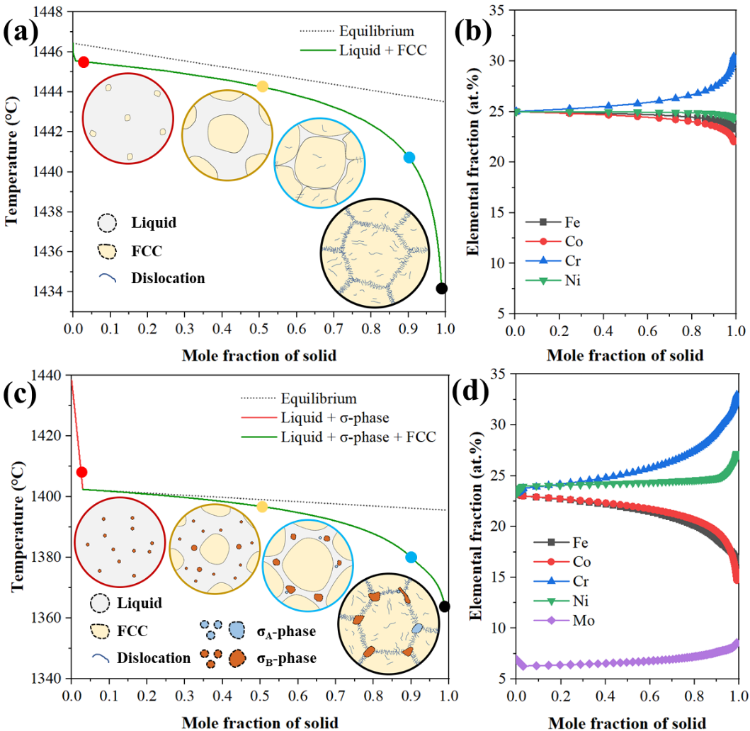 图2 FeCoCrNi和FeCoCrNiMo0.3两种HEAs的非平衡凝固过程