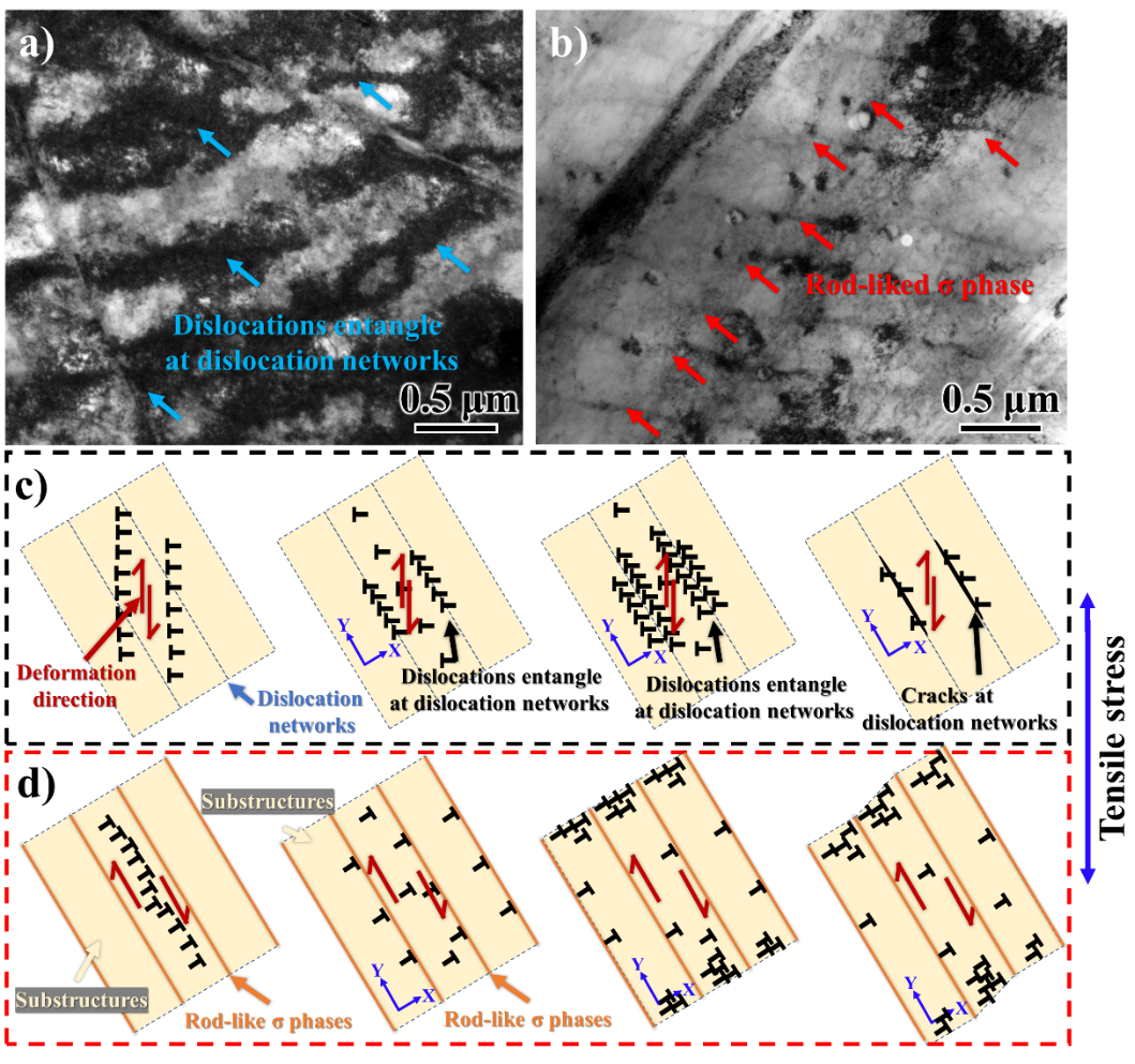 该研究还通过热力学计算和显微组织观察,揭示了σ相的形成机制和以及变形过程中的位错疏导机制。研究发现,σ相可以分为两种,富Cr的σA相主要在最终凝固过程中析出,而富Mo的σB相在凝固初期析出,这导致了σB相在凝固过程中不断阻碍亚晶长大,并且伴随基体同步生长,促进了σ相框架的形成。σ相框架的引入提高了变形过程中位错滑移的阻力,同时框架对基体的固定作用显著诱导了位错沿平行于析出相方向进行滑移,避免了亚结构边界的位错塞积而引起的局部应力集中,进一步提高了高熵合金抵抗不均匀塑性变形的能力。该设计理念将为同时提高激光增材制造高熵合金的强塑性提供新思路,为金属材料力学性能强化机制的进一步完善添砖加瓦。