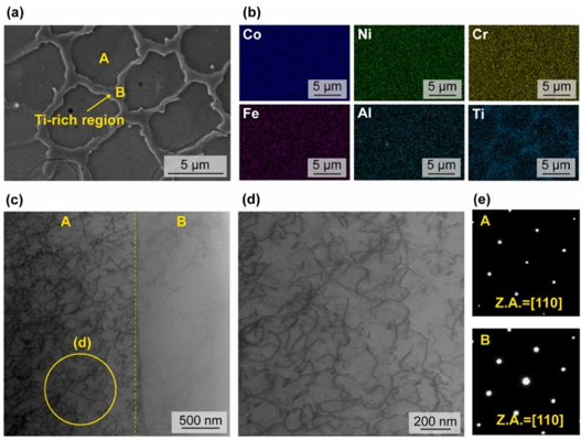 图3 . AP - HEA的基本显微结构( a ) SEM图像显示出典型的胞状结构。( b )对应的EDS图谱显示,管壁存在明显的富Ti区。( c )和( d ) BF - STEM面扫描清晰地显示了高密度位错。( e )通过沿[ 110 ]晶带轴( Z.A.表示为区域轴)的选区电子衍射花样确定A和B均为面心立方晶体结构。