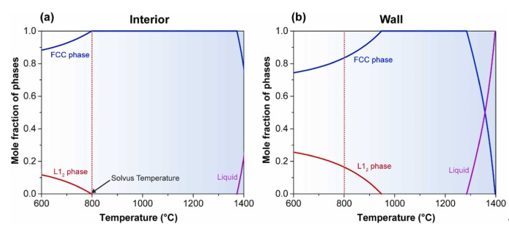 图10 .在600°C到1400°C的温度范围内,( a )内区和( b )壁区的平衡相及其摩尔分数。L12相在内部的固溶温度为797℃,而在壁面处的固溶温度为948℃。
