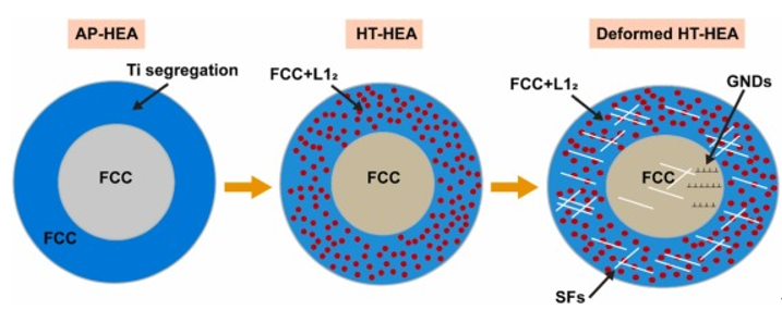 图11 .图解显示了具有优异强度-塑性协同作用的增材制造蜂窝结构高熵合金的微观组织演变和相关的变形机制。如图所示,Ti偏析发生在AP - HEA的壁上。随后的热处理在壁面产生高密度的L12沉淀。在塑性变形条件下,SF主导的变形机制和内部和壁区的附加HDI应变硬化对实现蜂窝结构HEA的高强度和高塑性起着至关重要的作用。