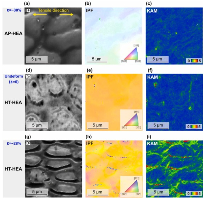 图7 . HT - HEA样品的内部和壁之间存在显著的应变分配,产生了28 %的塑性应变。( a ) - ( c ) AP - HEA试样经30 %塑性应变变形后的IQ、IPF和KAM图。未变形AP - HEA样品的( d ) - ( f ) IQ、IPF和KAM图谱。HT - HEA样品经28 %塑性应变变形后的( g ) - ( i ) IQ、IPF和KAM图。在内部/壁面界面处观察到较大的KAM值。