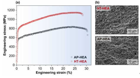 图6 .增材制造高熵合金的力学性能和断裂机制。( a )与AP相比,HT - HEA的工程应力-应变曲线显示出强度的显著增加,而塑性没有恶化。( b )两种断口的高倍SEM图像都显示出致密的韧窝,这意味着典型的韧性断裂模式。