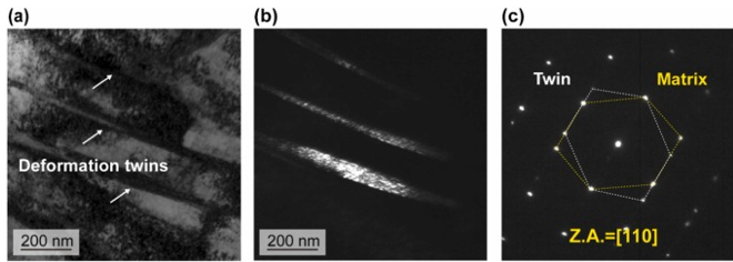 图9:AP - HEA的变形微观组织经受30 %的塑性应变。( a )具有代表性的机械纳米孪晶的TEM图像。( b ) Df - Tem图像。( c )沿[ 110 ]晶带轴的SAED花样突出了形变孪晶。