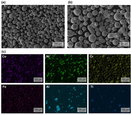 图1 . ( a )和( b )为混合粉体球形形貌的SEM照片。( c )显示元素分布。