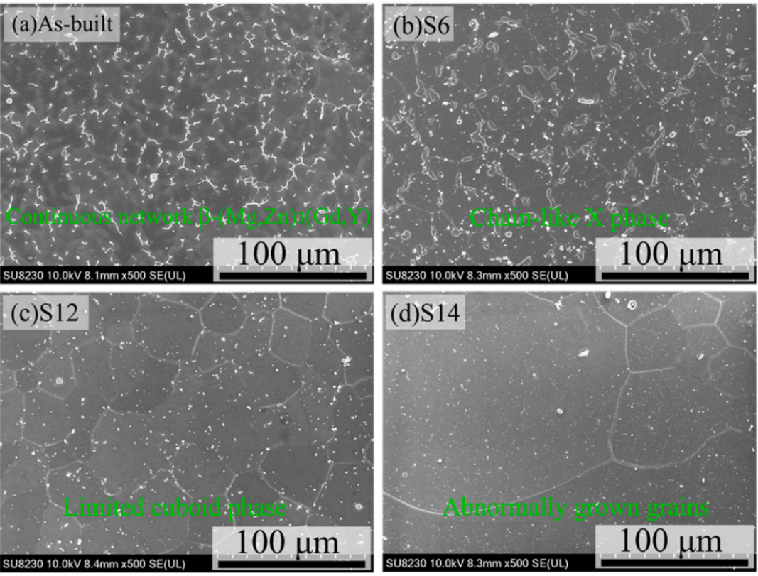 ( a )原始试样,在530℃下固溶处理( b ) 6 h,( c ) 12 h和( d ) 14 h的SEM结果。图7b和S1中的表征结果表明,在固溶初期,连续网状的β - ( Mg、Zn)3( Gd , Y)转变为链状的X相。事实上,先前的研究表明,晶界附近的β - ( Mg、Zn)3( Gd , Y)有向X相转变的趋势,而晶粒内部的β - ( Mg,Zn ) 3( Gd , Y)更容易转变为层片状的14H - LPSO结构。