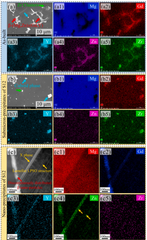 ( a , a1 ~ a5)原始样品、( b , b1 ~ b5)溶液在530℃下处理12 h ( S12样品)的SEM图像和相应的EDS 映射的结果。( c , c1 ~ c5)溶液在530℃下处理12 h ( S12试样)的高角角暗场( HAADF )图像和相应的EDS 映射的结果。8a和8b,可以注意到随着固溶时间的延长,长方体相发生了一定程度的长大。长方体相的形成极大地影响了合金的力学性能,尤其是其延伸率,但长方体相的形成难以避免。